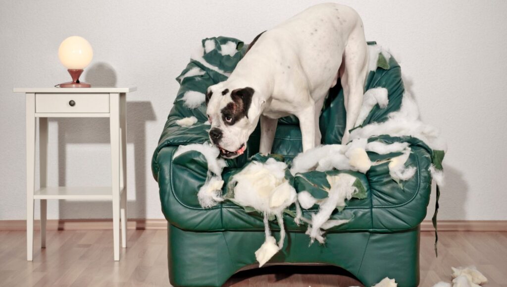 Comportamentos destrutivos (mastigar móveis, portas, etc.) podem surgir da ansiedade canina