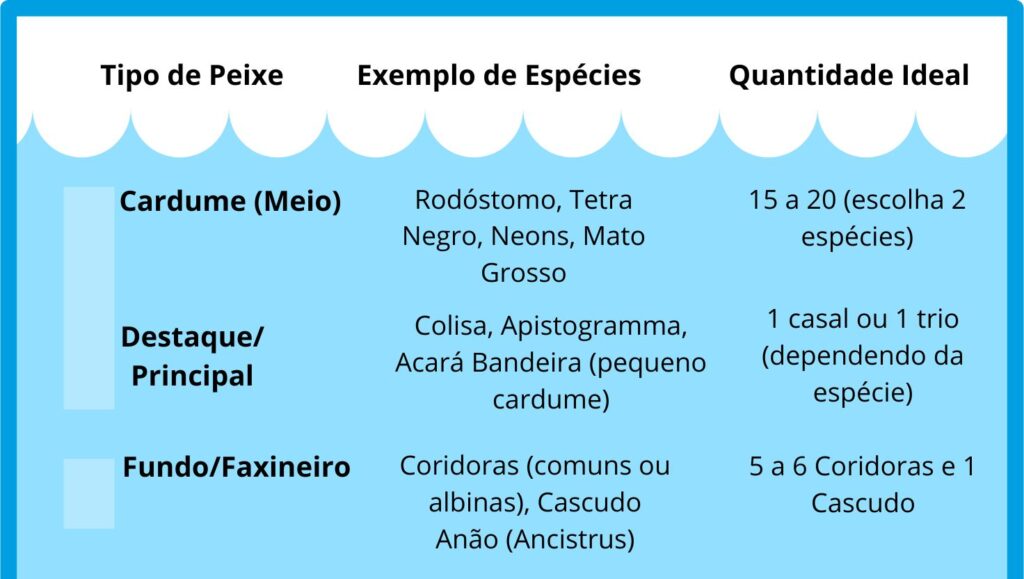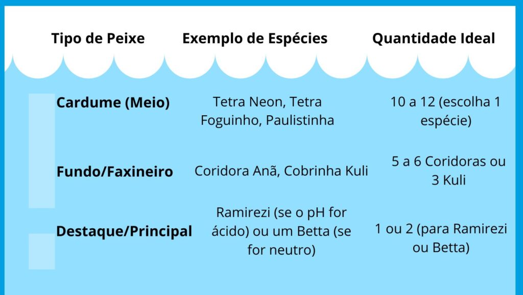 Para facilitar sua vida, veja exemplos de fauna adequada para aquários de tamanhos populares. Estes exemplos consideram aquários bem filtrados e, preferencialmente, plantados, o que ajuda na estabilidade da água.