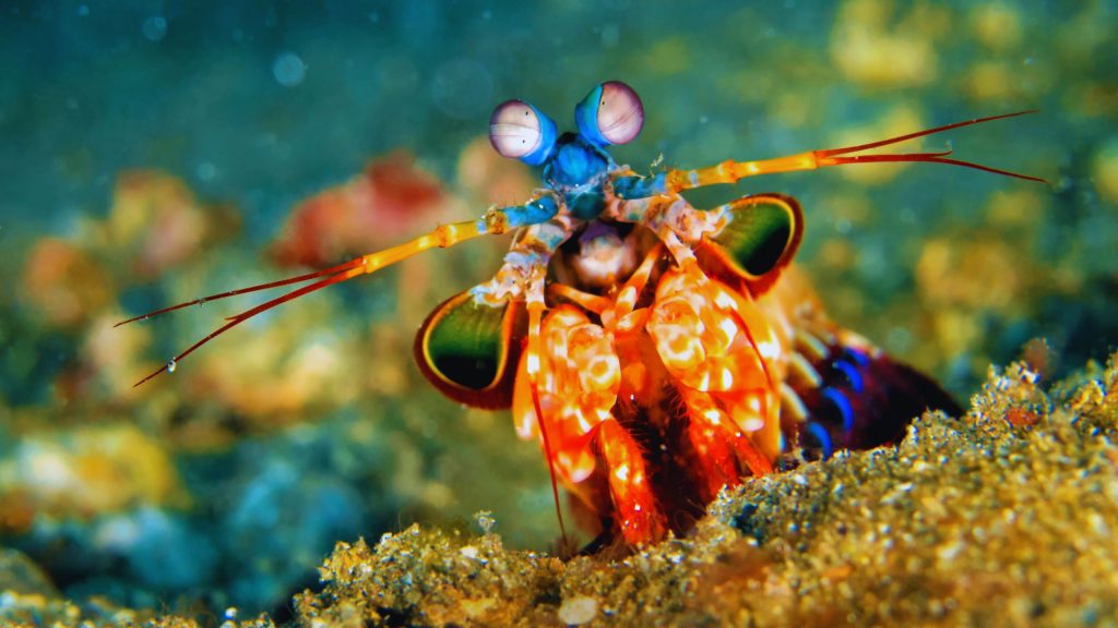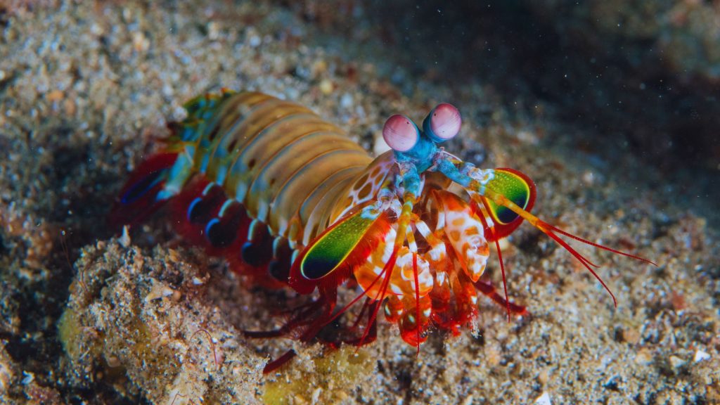 Comumente encontrado nos oceanos Pacífico e Índico, o camarão-louva-a-deus-palhaço pertence à ordem Stomatopoda. As mais de 400 espécies dessa categoria morfológica são conhecidas por sua segunda pata torácica, um membro extremamente forte e desenvolvido que consegue destruir presas com facilidade.