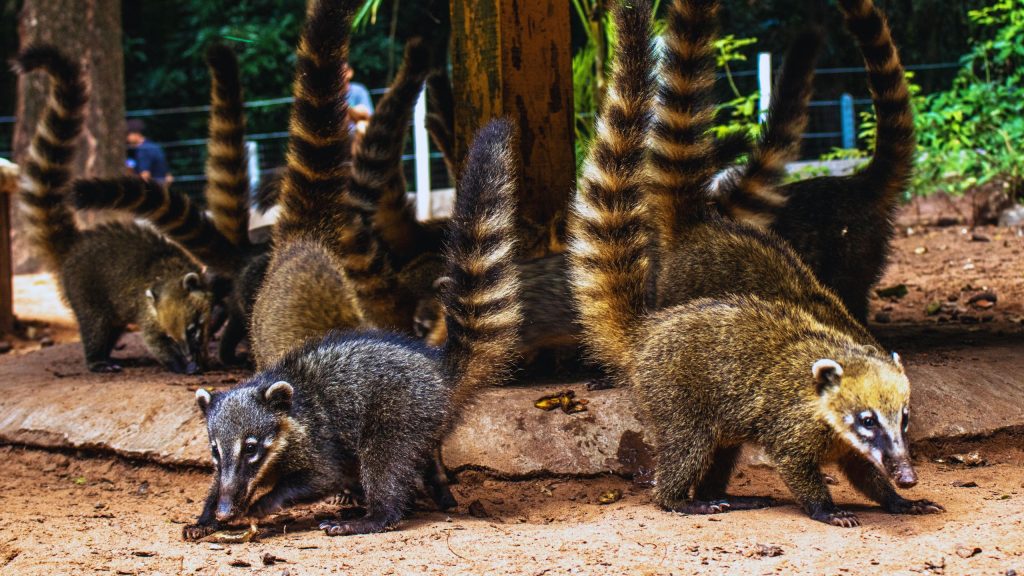 Curiosidades: Forma grupos de fêmeas e jovens que percorrem diariamente seu território à procura de alimento, tanto no chão como nas copas das árvores, e comunica-se por meio de sons e gestos das caudas. Os machos adultos costumam ser solitários. São reconhecidas duas espécies de quati no mundo, sendo Nasua nasua com ocorrência para a América do Sul e o quati-de-focinho-branco (Nasua narica), para o sul dos Estados Unidos e América Central.