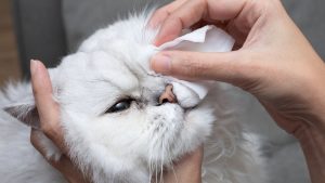 Manter a região dos olhos sempre limpa é uma maneira de evitar que a secreção manche o pelo do animal. Passe uma gaze limpa ou algodão com soro fisiológico no local da mancha, duas vezes ao dia, e depois use outra gaze ou algodão para manter a região bem seca.