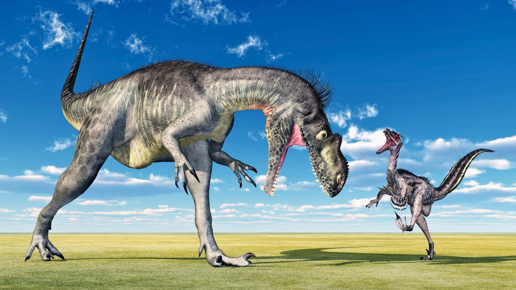 O megalossauro, na imagem acima em embate com um velociraptor, viveu durante o período Jurássico.
