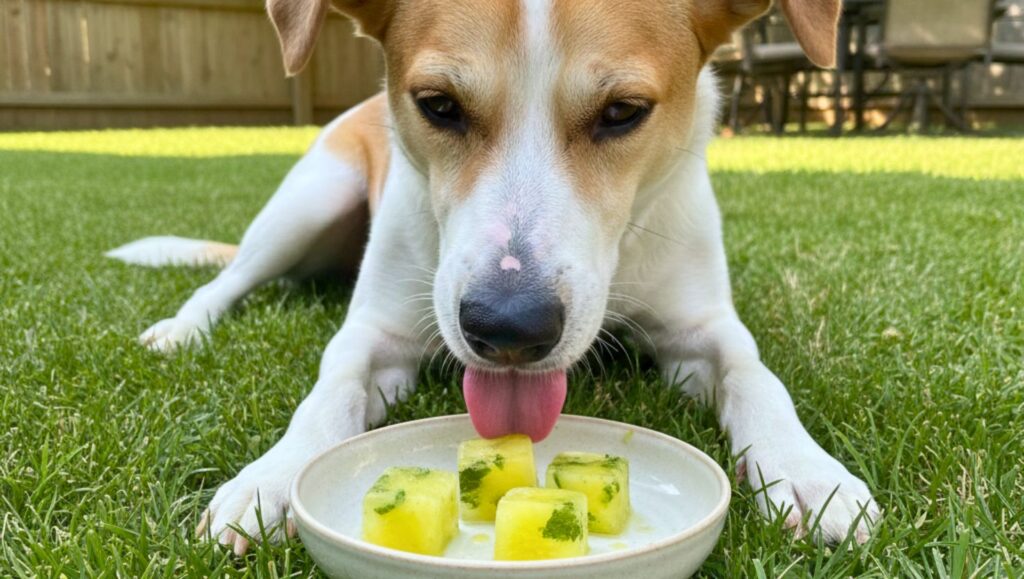 • Como fazer: Use 3 rodelas grossas de abacaxi (sem casca) e 2 a 3 folhas de hortelã. Bata com ½ copo de água no liquidificador. Congele em forminhas. Ainda assim, sirva pequenas porções para cães sensíveis.