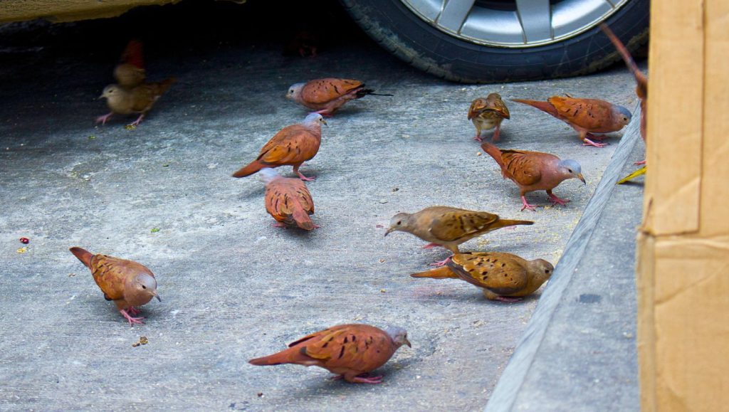 Rolinha-fogo (Columbina squammata): Possui plumagem marrom-avermelhada, com escamas pretas nas asas e no corpo.